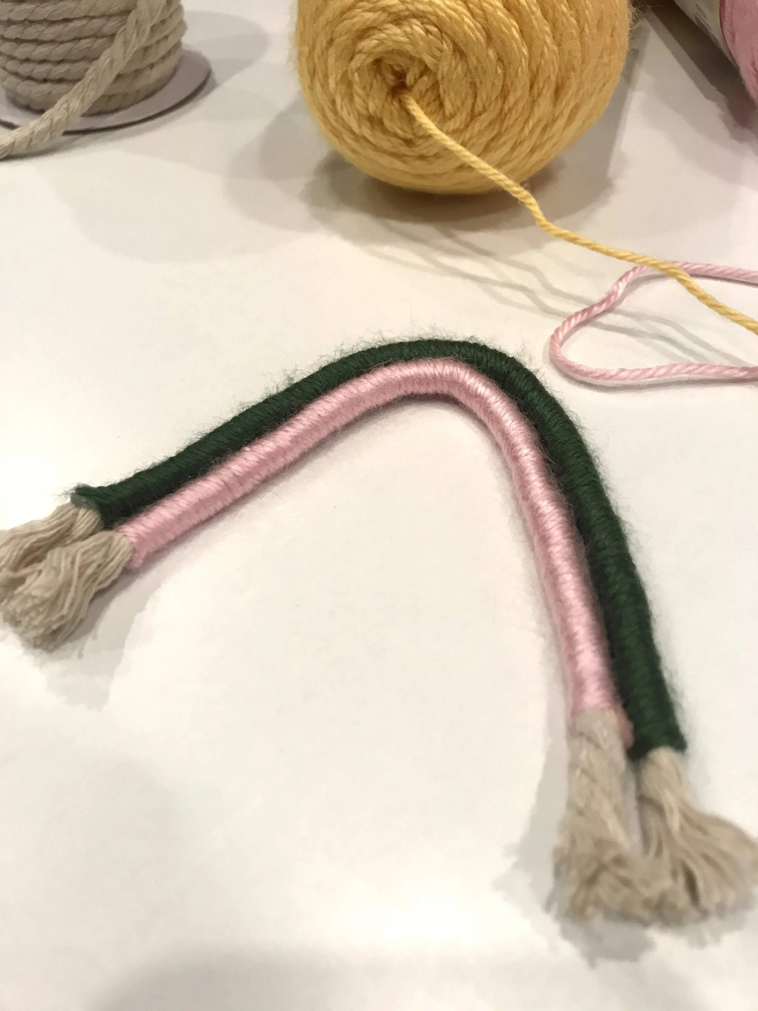 6. Repeat this process with the next two pieces of cut rope, changing the color of yarn each time.